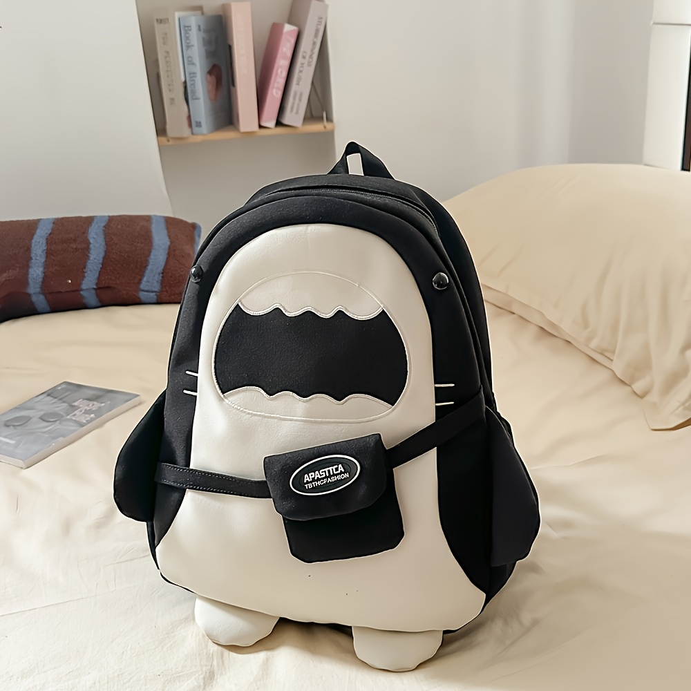 Stylish Black Nylon Backpack with Adjustable Straps - Cartoon Shark Design, Lightweight & Durable, Perfect for Students or Casual Use, Casual Daypack | Playful Design | Secure Zipper Closure