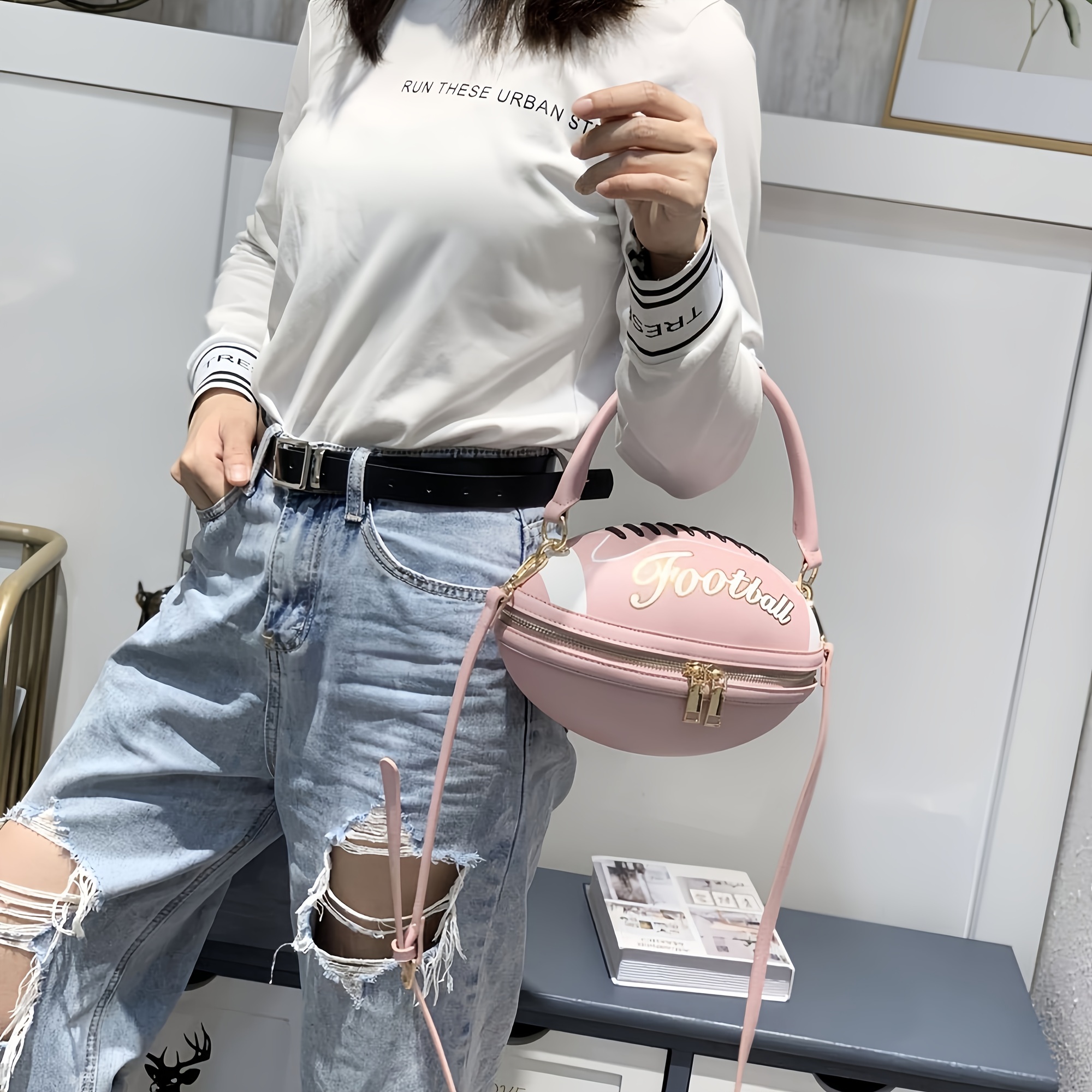 Fashion Football Shaped Handbag, Sports Theme Crossbody Bag with Adjustable Strap, Lightweight Zippered Tote with Polyester Lining, Positioning Print, Edge Paint Detail - Available in Black, White, Light Brown, Earthy Yellow
